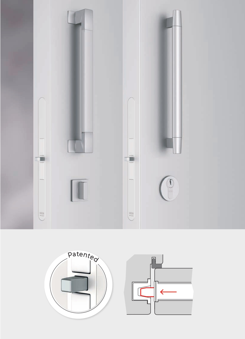 Удержание двери происходит с помощью специальных магнитов, данная система является запатентованной: бесконтактный дверной захват обеспечивает плавный ход двери. При необходимости увеличения прижимной силы можно использовать дополнительно несколько пар магнитов. Величину вылета магнитов, всегда можно отрегулировать. Центральный засов, позволяющий закрыть дверь на замок, выходит благодаря регулируемому пружинному механизму, который позволяет компенсировать дверной зазор.