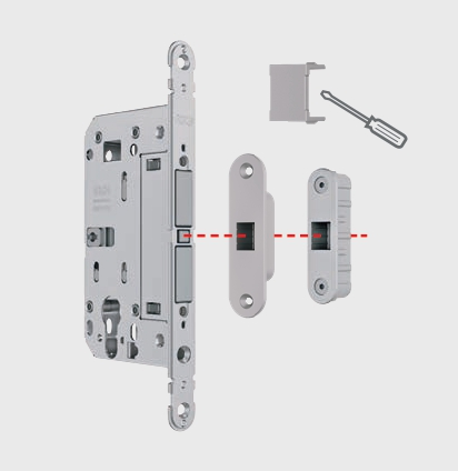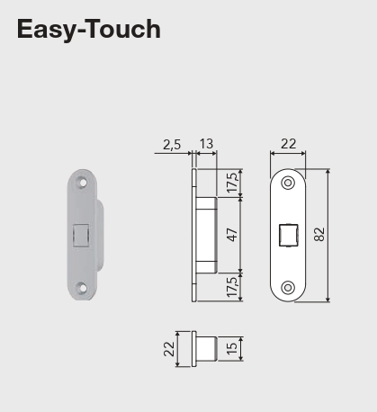 Замок универсален - он легко устанавливается в посадочное место замков моделей Polaris 2XT и Mediana Evolution от фабрики AGB. При использовании ответной планки Easy-Touchс замками Touch & Close нужно удалить заглушку в середине, которая находится между двумя неподвижными магнитами.